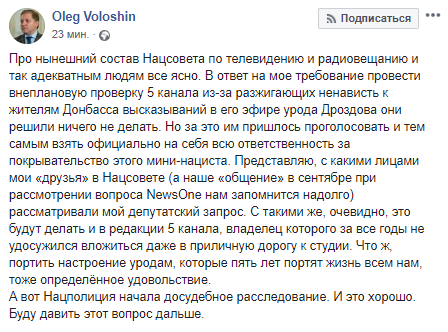 "В ответ на мое требование провести внеплановую проверку 5 канала из-за разжигающих ненависть к жителям Донбасса высказываний в его эфире урода Дроздова они решили ничего не делать. Но за это им пришлось проголосовать и тем самым взять официально на себя всю ответственность за покрывательство этого мини-нациста. Представляю, с какими лицами мои "друзья" в Нацсовете (а наше "общение" в сентябре при рассмотрении вопроса NewsOne нам запомнится надолго) рассматривали мой депутатский запрос. С такими же, очевидно, это будут делать и в редакции 5 канала, владелец которого за все годы не удосужился вложиться даже в приличную дорогу к студии. Что ж, портить настроение уродам, которые пять лет портят жизнь всем нам, тоже определённое удовольствие", - написал Волошин.