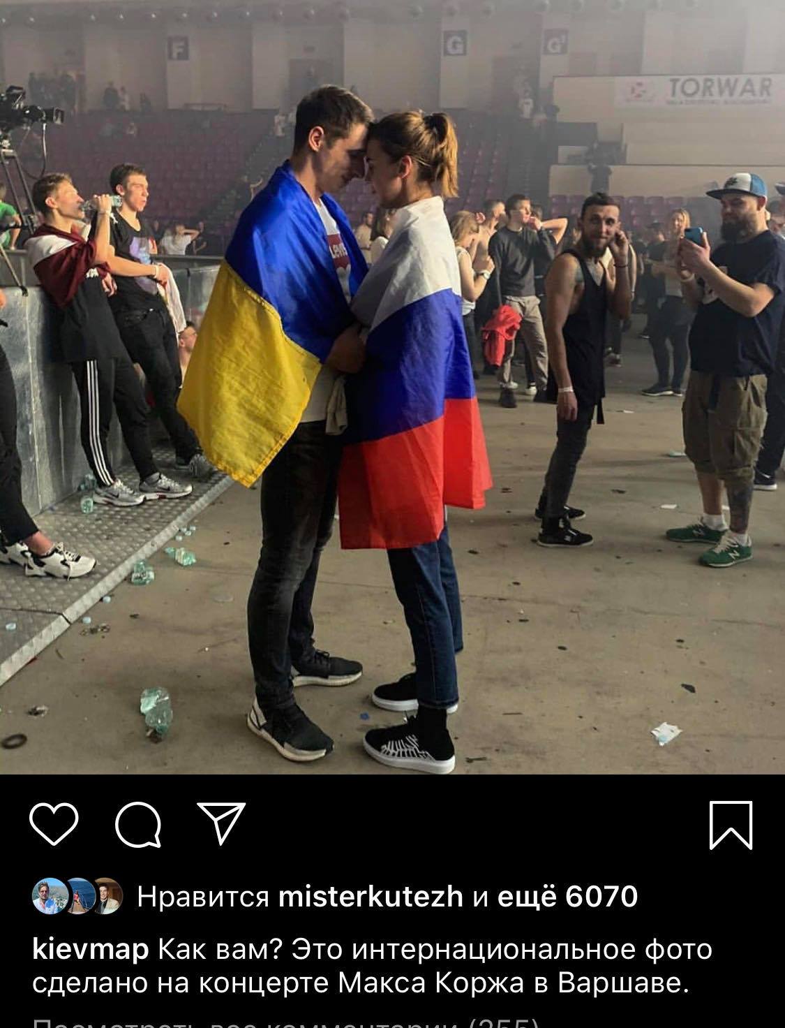 Отметим, что на концертах Макса Коржа часто появляются такие примиренческие мотивы. Недавно в Москве фанаты певца подняли рядом три флага: Украины, России и Беларуси.