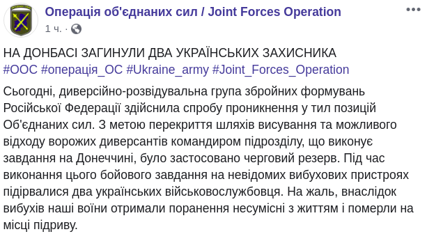 "Сегодня диверсионно-разведывательная группа вооруженных формирований Российской Федерации осуществила попытку проникновения в тыл позиций Объединенных сил. С целью перекрытия путей выдвижения и возможного ухода вражеских диверсантов командиром подразделения, выполняющего задачи в Донецкой области, был применен очередной резерв. Во время выполнения этого боевого задания на неизвестных взрывных устройствах подорвались два украинских военнослужащих", - говорится в сообщении.