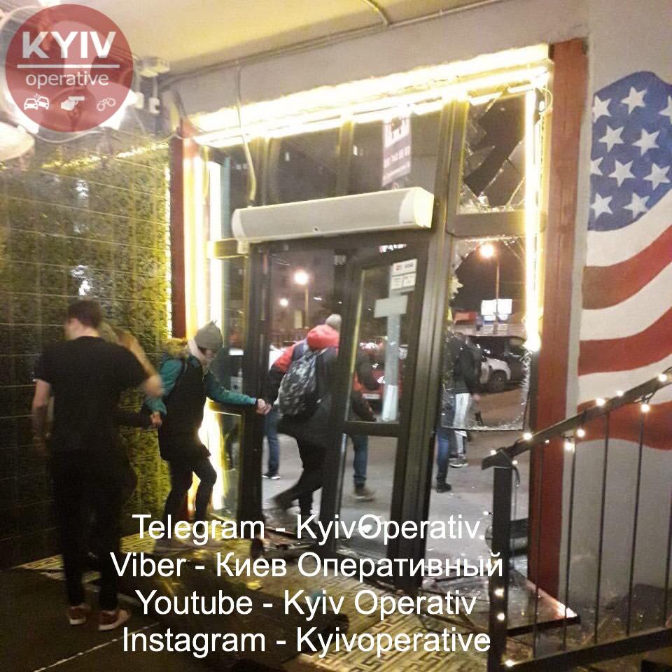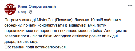 "Погром в заведении MisterCat, Позняки. Около 10 человек зашли внутрь, начали конфликтовать с посетителями, потом переключились на персонал и началась массовая драка. Но и этим не закончилось - после драки молодые люди автомобилем разнесли входные двери заведения. Обстоятельства происшествия устанавливаются", - уточнили свидетели.