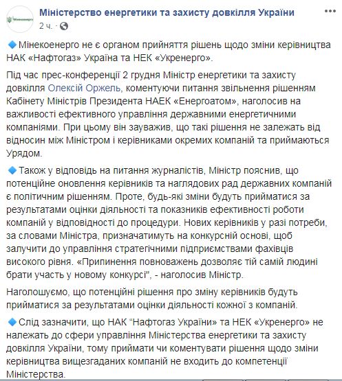 "Следует отметить, что "Нафтогаз Украины" и "Укрэнерго" не относятся к сфере управления Министерства энергетики и защиты окружающей среды Украины, поэтому принимать или комментировать решение об изменении руководства вышеупомянутых компаний не входит в компетенцию Министерства", - резюмируется в сообщении.