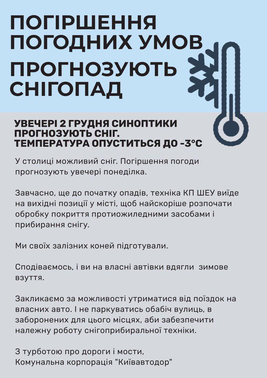 "Киевавтодор" призывает по возможности воздержаться от поездок на собственных авто. "И не парковаться вдоль улиц, в запрещенных для этого местах, чтобы обеспечить надлежащую работу снегоуборочной техники", - пишут коммунальщики.
