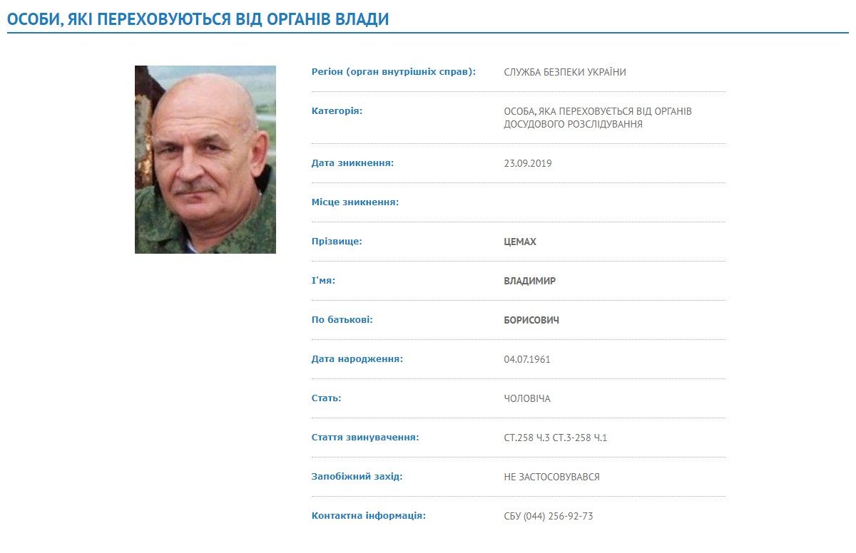 Как сообщается, Цемах числится в списке разыскиваемых лиц. По данным ведомства, в розыск Цемаха подала Служба безопасности Украины, а меру пресечения в отношении него украинская сторона не применяла.