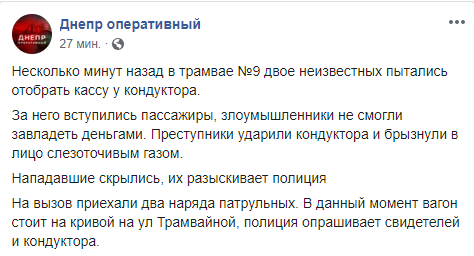 "Несколько минут назад в трамвае №9 двое неизвестных пытались отобрать кассу у кондуктора. За него вступились пассажиры, злоумышленники не смогли завладеть деньгами. Преступники ударили кондуктора и брызнули в лицо слезоточивым газом. Нападавшие скрылись, их разыскивает полиция", - говорится в сообщении.