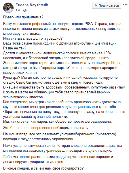 Экс-советник главы Минздрава Зоряны Скалецкой Евгений Найштетик написал, что мы, как страна и народ, деградировали, и результаты PISA подтверждают это.