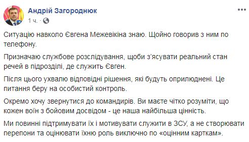 Министр обороны Андрей Загороднюк изучает ситуацию о неаттестации подполковника, боевого генерала, Героя Украины Евгения Межевикина (позывной Адам) и назначил служебное расследование для выяснения обстоятельств инцидента. Об этом он сообщил на своей странице в Facebook.