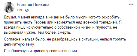 В итоге Плихина извинилась за свой пост, а также выразила соболезнования, отметив, что не намерена кого-то обижать или высмеивать.