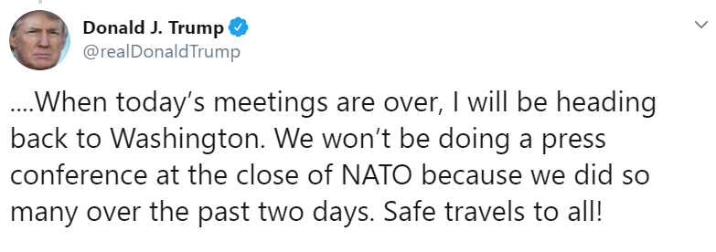 Итоговая пресс-конференция после лондонской конференции НАТО отменена. Об этом в среду, 4 декабря, говорится в твиттер-микроблоге президента США Дональда Трампа.