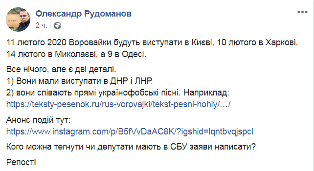 Журналист Александр Рудоманов возмутился гастролями в Украине группы "Воровайки" (известной по своему хиту "Хоп мусорок" и другим блатным песням) и призвал депутатов писать по этому поводу заявления в СБУ.