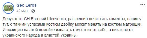 После эфира на депутата набросился Гео Лерос, который порекомендовал коллеге  "прийти на сессию в костюме матрешки". "Депутат от СН Евгений Шевченко, раз решил почистить коменты, напишу тут, с такими успехами костюм двойку может менять на костюм матрешки. И позицию на этой помойке излагать ему стоит от себя, а никак не от украинского народа и властей Украины", - написал Лерос. После него критику Шевченко подхватили и другие депутаты.