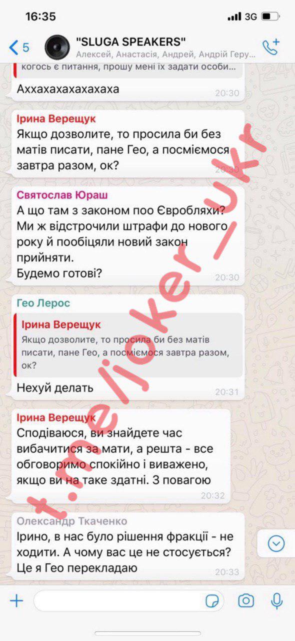 Ранее часть этой переписки сфотографировало издание "Буквы". Там обсуждались законопроекты, рассматриваемые сегодня. В этом контексте шла и письменная перепалка Ирины Верещук и Гео Лероса.