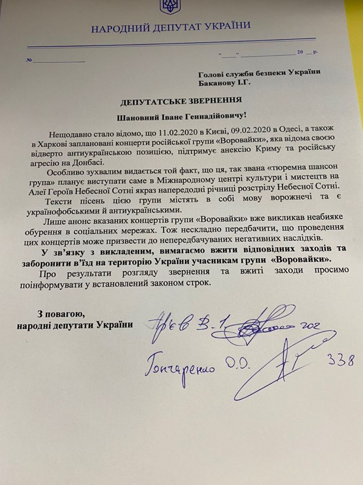 Депутаты от фракции "Европейская солидарность" Алексей Гончаренко и Владимир Арьев обратились с требованием к главе СБУ Ивану Баканову запретить участникам российской блат-поп группы "Воровайки" поводить гастроли на территории Украины в 2020 году.