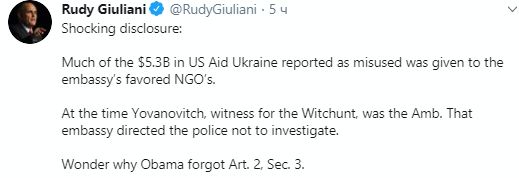 Как утверждает Джулиани, в Украине ненадлежащим образом использовали выделенные в качестве помощи США 5,3 млрд долларов. Причем большая их часть была израсходована на неправительственные организации посольства США, которое в свою очередь надавило на украинскую полицию, чтобы силовики не проводили расследование.