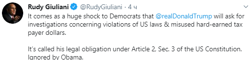 "Для демократов это огромный шок, что Дональд Трамп попросит провести расследование в отношении нарушений законов США и злоупотребления, которые касаются с трудом заработанных налогоплательщиками долларов. Это называется его юридическим обязательством по статье 2, гл. 3 Конституции США, которое было проигнорировано Обамой" - добавил Джулиани.