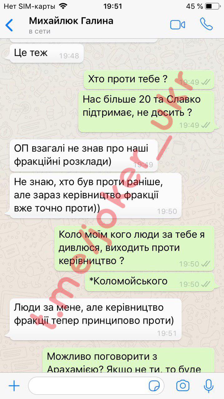 Также в переписке упоминается Давид Арахамия. По словам Михайлюк, он оклеветал ее, заявив, что она не прошла проверку в СБУ.