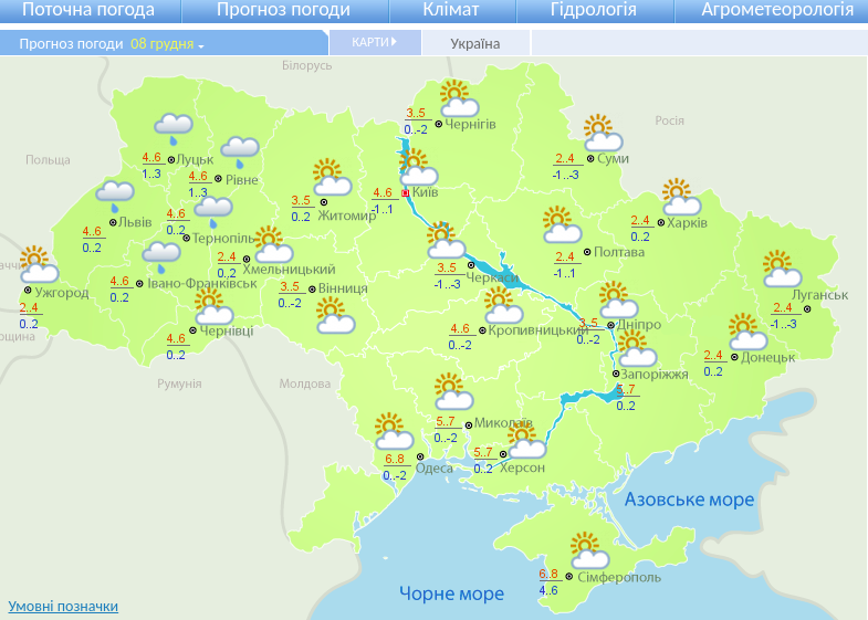 Во всех западных регионах страны будет +2...+6 днем и -2...+2 ночью. В Луцке, Ровно и Тернополе ожидаются небольшие дожди.