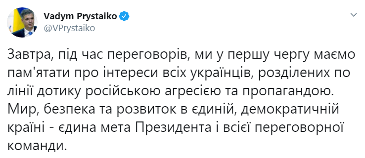 "Завтра, во время переговоров, мы в первую очередь должны помнить об интересах всех украинцев, разделенных по линии соприкосновения российской агрессией и пропагандой. Мир, безопасность и развитие в единой, демократической стране - единственная цель президента и всей переговорной команды", - написал чиновник.