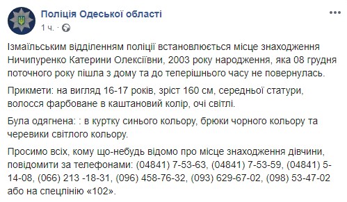 Полиция Одесской области устанавливает местонахождение Екатерины Ничипуренко, 2003 года рождения, которая пропала 8 декабря этого года, после того как ушла из дома и до сих пор не вернулась. Об этом сообщает пресс-служба Нацполиии региона.