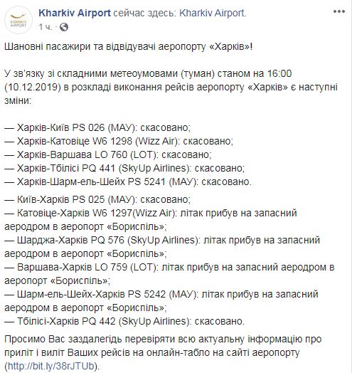 Харьковский аэропорт объявил об отмене семи рейсов из-за тумана