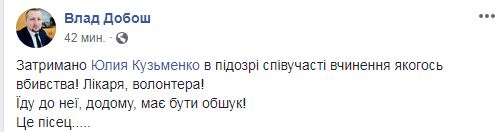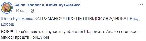 На странице Юлии Кузьменко в Facebook ее друзья пишут, что ей "предъявляют соучастие в убийстве Шеремета" и что "Аваков объявил массовые аресты и обыски!".