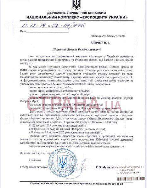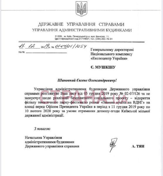 Как выяснилось, гендиректор Национального комплекса "Экспоцентр Украины" Евгений Мушкин обратился с просьбой к столичному мэру Виталию Кличко открыть возле здания Офиса президента "бесплатный социальный проект", который в письме именуется филиалом "Зимней страны на ВДНХ".