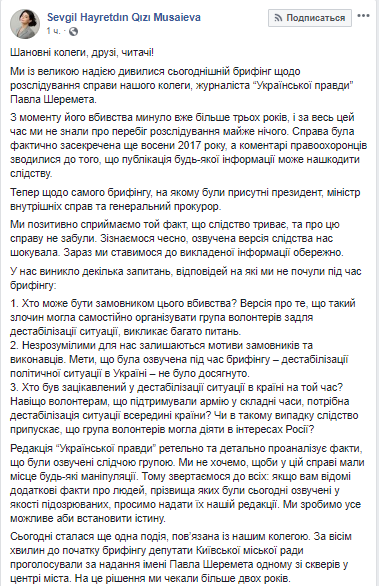 Главный редактор "Украинской правды" (в которой работал Шеремет) Севгиль Мусаева написала, что издание положительно восприняло то, что расследование продолжается, но версия следствия шокировала.