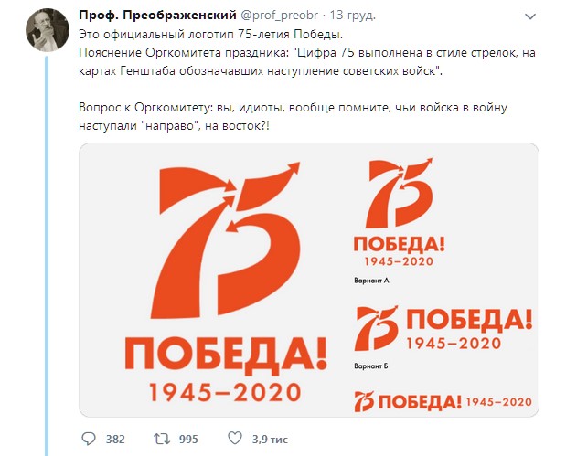 "Если уж и делать стрелки, то направление их должно быть в другую сторону, на Запад", "Чуть похоже на стилизованную свастику...", "Где красная звезда с серпом и молотом? Где профиль верховного главнокомандующего Красной Армии?", "Вопрос к Оргкомитету: вы, и*иоты, вообще помните, чьи войска в войну наступали "направо", на восток?", - пишут пользователи.