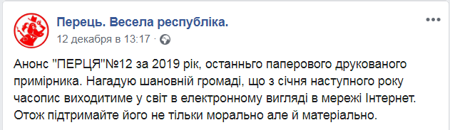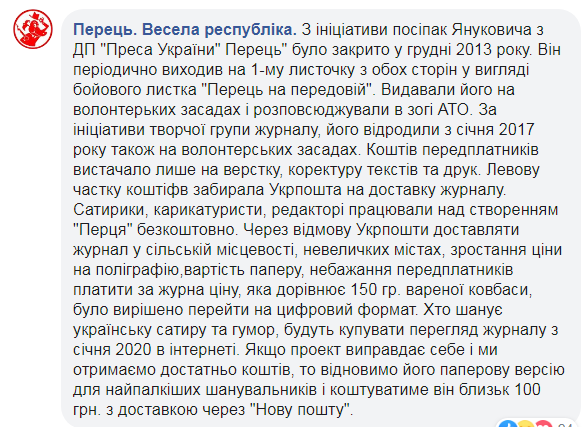 "По инициативе прихвостней Януковича из ГП "Пресса Украины" "Перец" закрыли в декабре 2013 года. Он периодически выходил на одном листочке с обеих сторон в виде боевого листка "Перец на передовой". Выдавали его на волонтерских началах и распространяли в зоне АТО", - сказано в записи.