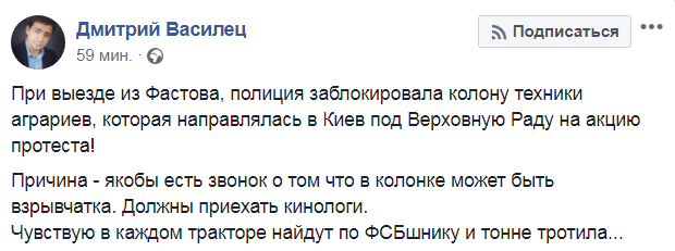 "...Полиция заблокировала колонну техники аграриев, которая направлялась в Киев под Верховную Раду на акцию протеста. Причина - якобы есть звонок о том, что в колонне может быть взрывчатка. Должны приехать кинологи. Чувствую в каждом тракторе найдут по ФСБшнику и тонне тротила...", - иронизирует журналист.