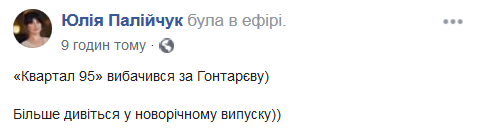 Пресс-секретарь фракции "Слуга народа" Юлия Палийчук в Facebook сообщила, что "Квартал 95" извиняется за Гонтареву и призвала смотреть новогоднее шоу.