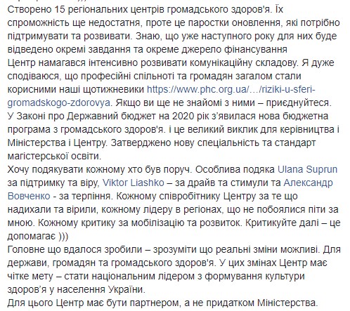 Ранее, 6 декабря, о своем намерении уволиться из МОЗ объявила также руководитель директората стратегического планирования и евроинтеграции Ирина Литовченко. Она уйдет из Министерства здравоохранения практически со всей своей командой. Речь о почти 10 работников. Литовченко объяснила свое решение различиями в ценностях и отсутствием стратегического видения у новой политической команды.