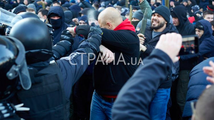 На фото и видео драка выглядела куда жестче, чем в рассказал националистов и полиции. В дело с обеих сторон шли газовые баллончики, правоохранители орудовали дубинками, уличные бойцы Билецкого - вывороченной брусчаткой и просто били полицейских руками и ногами.