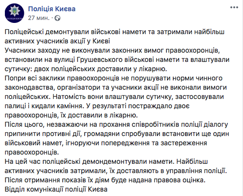 "Полицейские демонтировали военные палатки и задержали наиболее активных участников акции в Киеве.
