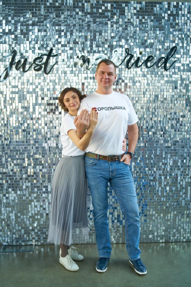 На молодых во время церемонии не было традиционных нарядов жениха и невесты. Булатов надел джинсы, кроссовки и футболку с надписью "Торопышка", а Василева - плиссированную юбку и футболку с надписью "Мармеладка".