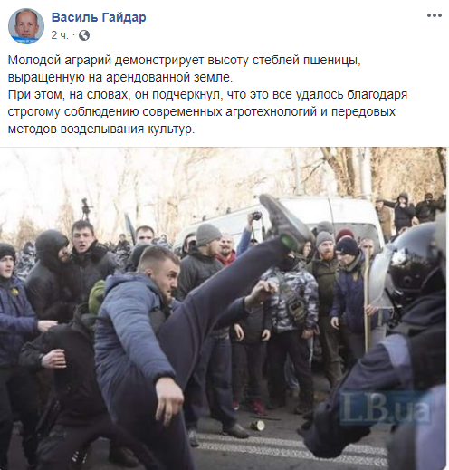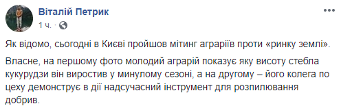 "Как известно, сегодня в Киеве прошел митинг аграриев против "рынка земли". Собственно, на первом фото молодой аграрий показывает какую высоту стебля кукурузы он вырастил в прошлом сезоне, а на втором - его коллега по цеху демонстрирует в действии современный инструмент для распыления удобрений" - пишет Виталий Петрик.