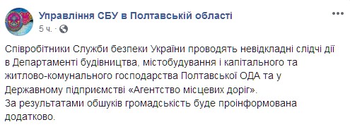 "Сотрудники Службы безопасности Украины проводят неотложные следственные действия в Департаменте строительства, градостроительства и капитального и жилищно-коммунального хозяйства Полтавской ОГА и в Государственном предприятии Агентство местных дорог. По результатам обысков общественность будет проинформирована дополнительно", - говорится в сообщении.