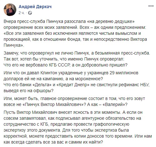 "Так вот, хотел бы уточнить, что именно Пинчук опровергал: Что его не вербовало КГБ СССР, а он добровольно пришел? Или что он давал Клинтон украденные у украинцев 29 млнв долларов ей не на кампанию, а на мороженное? Что его банки "Дельта" и "Кредит Днепр" не свистнули рефинанс НБУ, выведя его на офшоры? Или, может быть, главное опровержение состоит в том, что его зовут вовсе не "Пинчук Виктор Михайлович"? А как – "Валерий"?" – спросил Деркач.