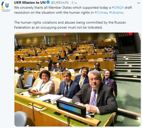 Генеральная ассамблея ООН поддержала внесенный украинской стороной проект резолюции о защите прав человека в Крыму в условиях российской оккупации.
