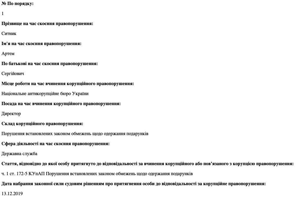 Напомним, что 6 сентября 2019 года Сарненский райсуд Ровенской области признал Артема Сытника виновным в нарушении ограничения для госслужащих при получении подарков (ч.1 ст.172-5 КУоАП), назначив ему в качестве наказания штраф 3400 гривен.
