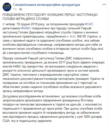 Также в сообщении говорится, что чиновница предложила организовать процесс приобретения гражданином Ирана гражданства Украины по якобы территориальному происхождению, которое должно было подтверждаться заведомо ложными официальными документамиь для дальнейшего получения им паспорта гражданина Украины и паспорта гражданина Украины для выезда за границу. За эту "услугу" чиновница просила 30 000 долларов США.