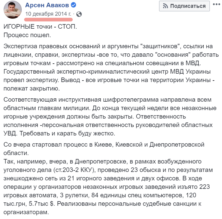 "Со вчера (9 декабря 2014 года - Ред.) стартовал процесс в Киеве, Киевской и Днепропетровской области. Так, например, вчера, в Днепропетровске, в рамках возбужденного уголовного дела (ст.203-2 ККУ), проведено 23 обыска и по результатам обезврежена сеть из 21 игорного заведения и двух офисов. В ходе операции у организаторов незаконных игровых заведений изъято 223 игровых автомата, 3 рулетки, 84 единицы спец компьютеров, 120 тыс.грн, 5.7 тыс $. Реализованы персональные судебные санкции к организаторам", - говорилось тогда на фб-странице министра внутренних дел.
