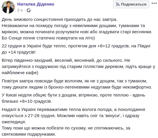 Синоптик Наталья Диденко рассказала о том, что 22 декабря в Украине будет тепло, в течение дня ожидается +8...+12 градусов, а на юге до +14 градусов. Об этом она написала на своей странице в Facebook.