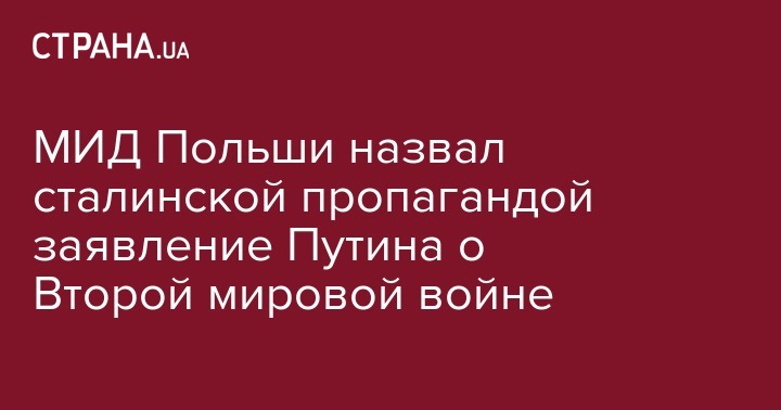 МИД Польши заявило, что слова президента России Владимира Путина о том, что Вторая мировая война началась не в результате пакта Молотова-Риббентропа, а Мюнхенского сговора 1938 года, где Польша также была агрессором против Чехословакии, фальсифицируют реальность и являются "пропагандой эпохи сталинского тоталитаризма". Официальное заявление опубликовано на сайте МИД.