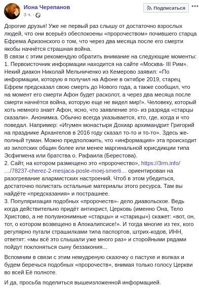 "По информации, которую я получил на Афоне в октябре 2019, старец Ефрем предсказал свою смерть до Нового года, а также сообщил, что на момент его смерти Афон будет расколот, а через два месяца после смерти начнётся война, которую еще не видел мир!"