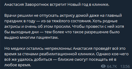 Как сообщается, врачи решили, что не будут отпускать актрису домой даже на главный праздник в году из-за ее тяжелого состояния. Хотя ее родные очень просили врачей, чтобы провести с ней хотя бы выходные дни — тем более что такое разрешение было выдано многим пациентам.