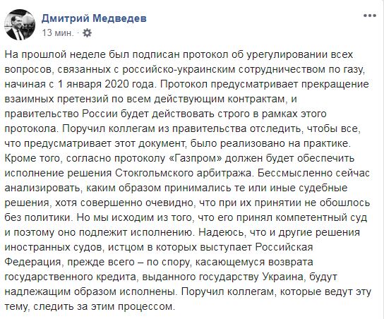 "На прошлой неделе был подписан протокол об урегулировании всех вопросов, связанных с российско-украинским сотрудничеством по газу, начиная с 1 января 2020 года. Протокол предусматривает прекращение взаимных претензий по всем действующим контрактам, и правительство России будет действовать строго в рамках этого протокола. Поручил коллегам из правительства отследить, чтобы все, что предусматривает этот документ, было реализовано на практике", - написал он.