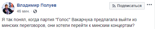 "Я так понял, когда партия "Голос" Вакарчука предлагала выйти из минских переговоров, они хотели перейти к минским концертам?" - написал журналист Владимир Полуев.