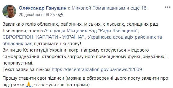 Председатель Львовского областного совета Александр Ганущин на своей странице в социальной сети Facebook призвал остальных своих коллег поддержать совместное обращение.