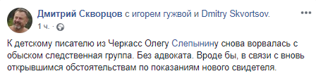 "К детскому писателю из Черкасс Олегу Слепынину снова ворвалась с обыском следственная группа. Без адвоката. Вроде бы, в связи с вновь открывшимся обстоятельствами по показаниям нового свидетеля", - написал Скворцов.