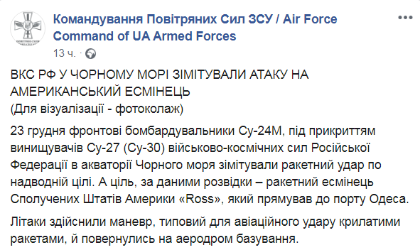 Фронтовые бомбардировщики Су-24М под прикрытием истребителей Су-27 (Су-30) военно-космических сил Российской Федерации в акватории Черного моря 23 декабря сымитировали ракетный удар по надводной цели. Об этом сообщает в Facebook командование воздушных сил ВСУ.